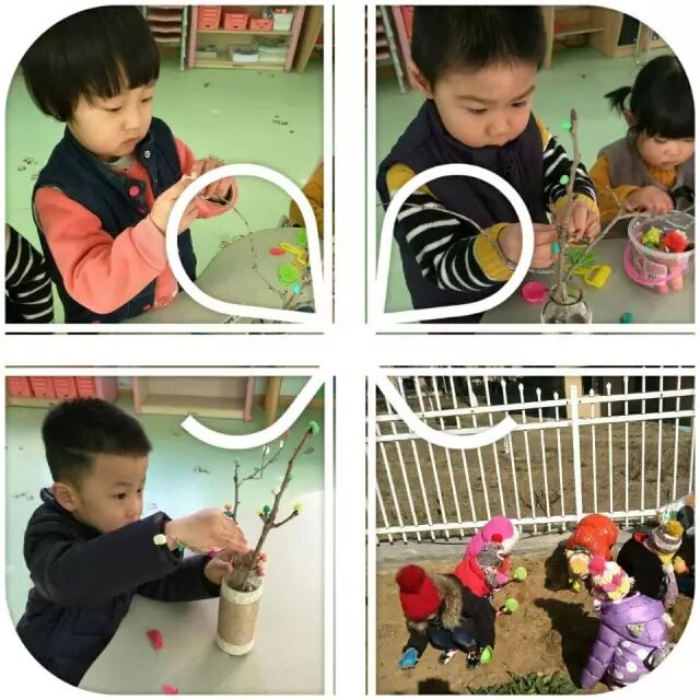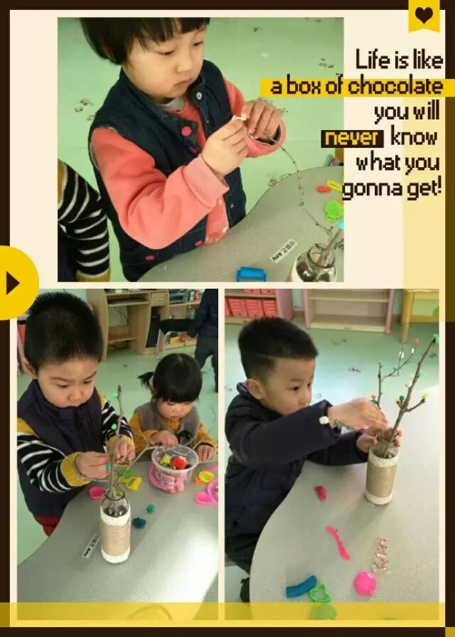 孩子们和老师一起制作了漂亮的插花,是用一些修剪下来的树枝加上孩子们的橡皮泥团制而成,有点冬末的唯美感。